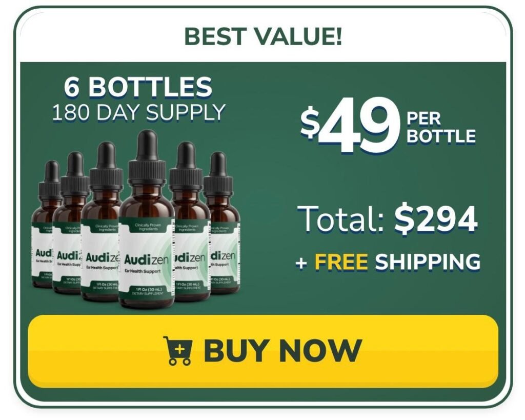 Six bottles of Audizen—formulated to silence tinnitus, support auditory health, restore clear hearing, combat oxidative stress, and protect neural pathways